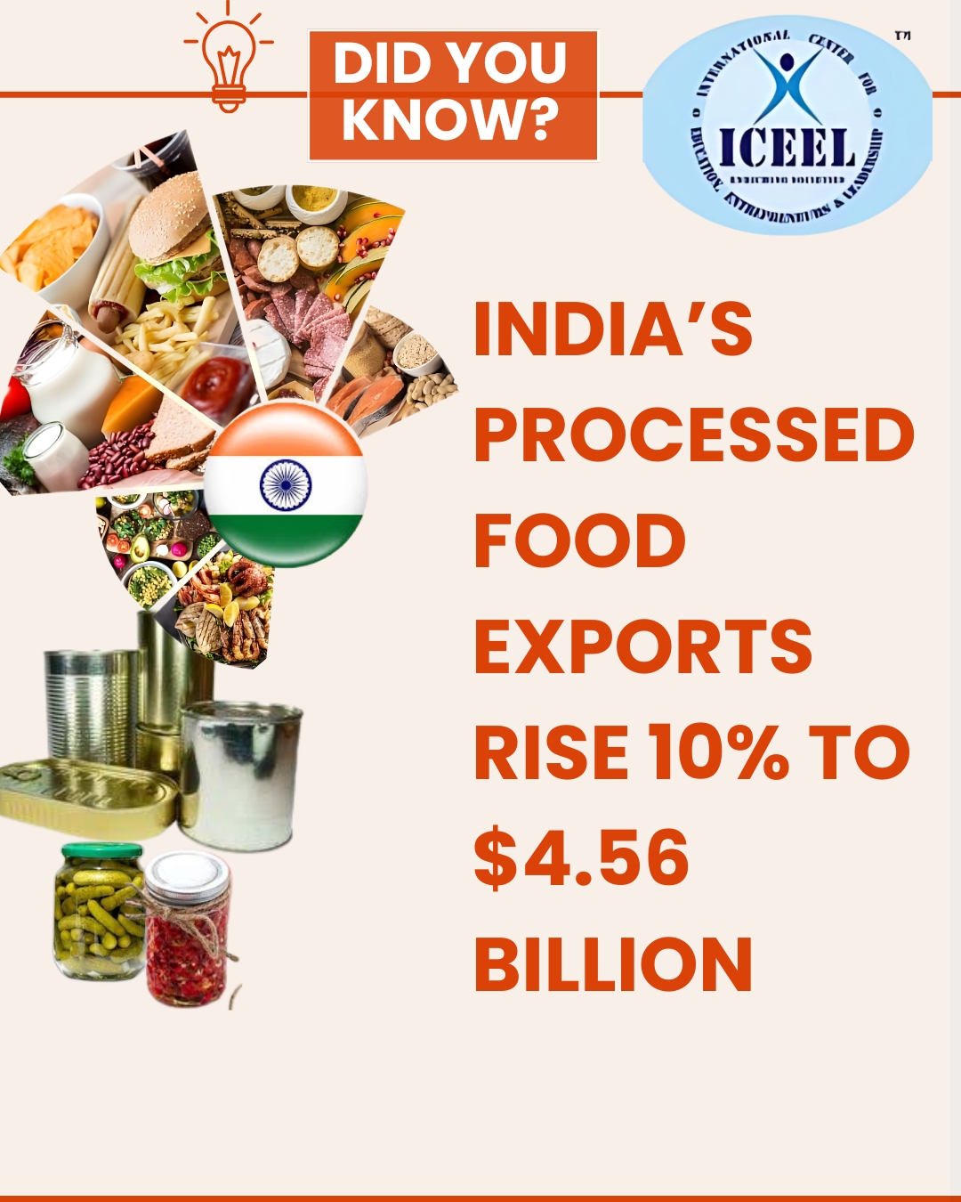 π India’s Processed Food Exports Jump 10% to $4.56 Billion π π India’s Processed Food Exports on a Strong Growth Path! π India’s processed food exports continue to rise steadily, reaching US$ 4.56 billion, up from US$ 4.16 billion last year — reflecting a consistent ~12% CAGR since FY2022. π πΉ Key Highlights β Top Export Markets: USA, UAE, UK, Canada, Russia & Australia β‘οΈ Emerging growth seen in Russia, Kenya & Philippines β Leading Export Segments: π½οΈ Misc. Edible Preparations – 35% π₯ Fruits, Vegetables & Nut Preparations – 23% πΎ Cereals / Flour / Milk Products – 18% β Growth Drivers: Strong global demand for Indian snacks, spices, mango pulp & ready-to-eat/cook products (RTE/RTC) β Future Outlook: India’s food processing sector is expanding rapidly and strengthening its position in global markets