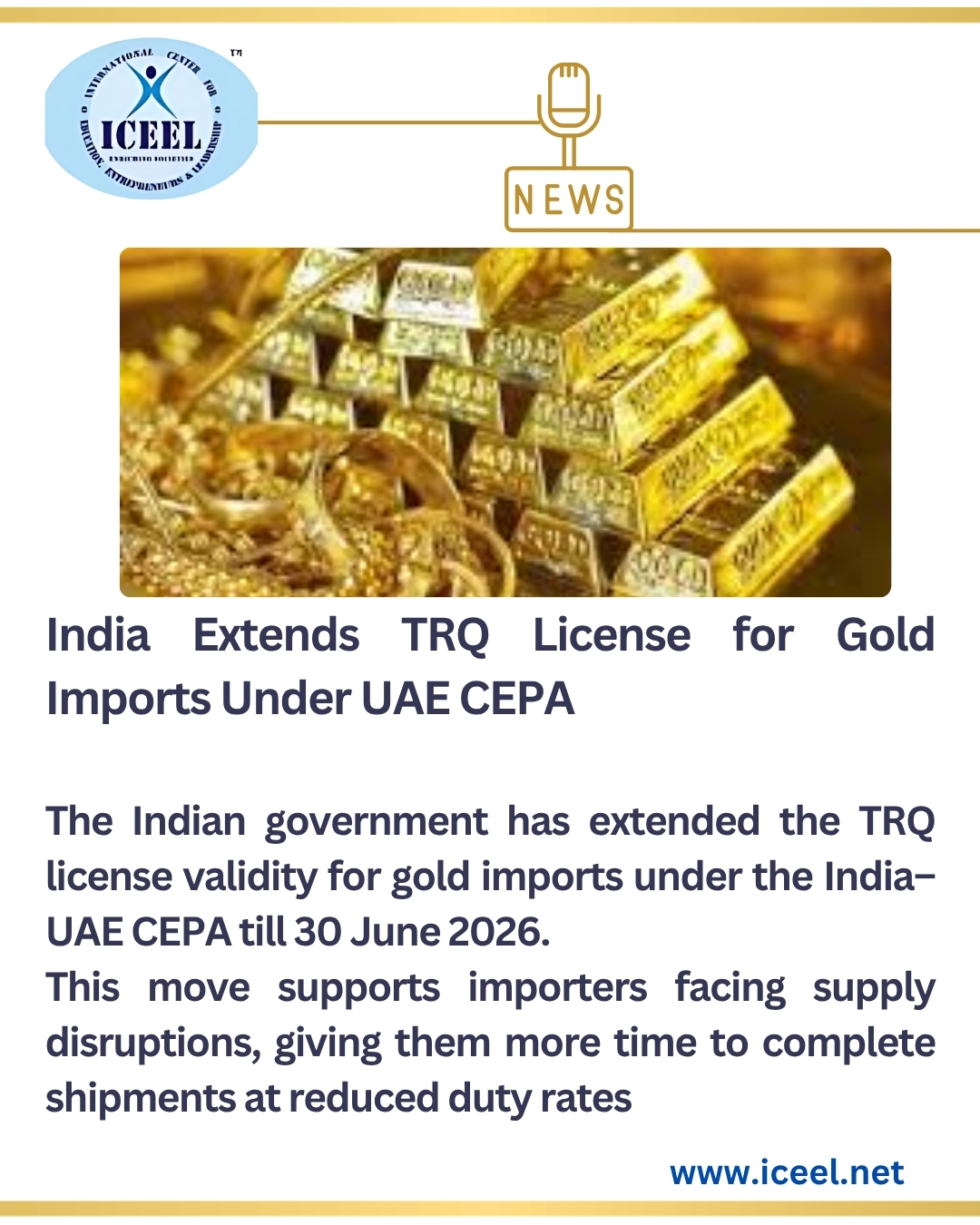 📦 India Extends Gold Import TRQ Deadline Under UAE CEPA 🌍 The Government of India has extended the TRQ license validity for gold imports till 30 June 2026, offering relief to importers facing global supply disruptions. 🔹 Key Highlights ✅ Extended Deadline: Valid till 30 June 2026 ✅ Automatic Extension: No application or extra fee required ✅ Benefit: Import gold at reduced duty (1%) under CEPA ✅ Support to MSMEs: Quota includes allocation for small businesses ✅ Industry Boost: Helps jewellery manufacturers manage costs & exports 🌍 This move strengthens India’s trade ecosystem and supports importers amid global challenges.