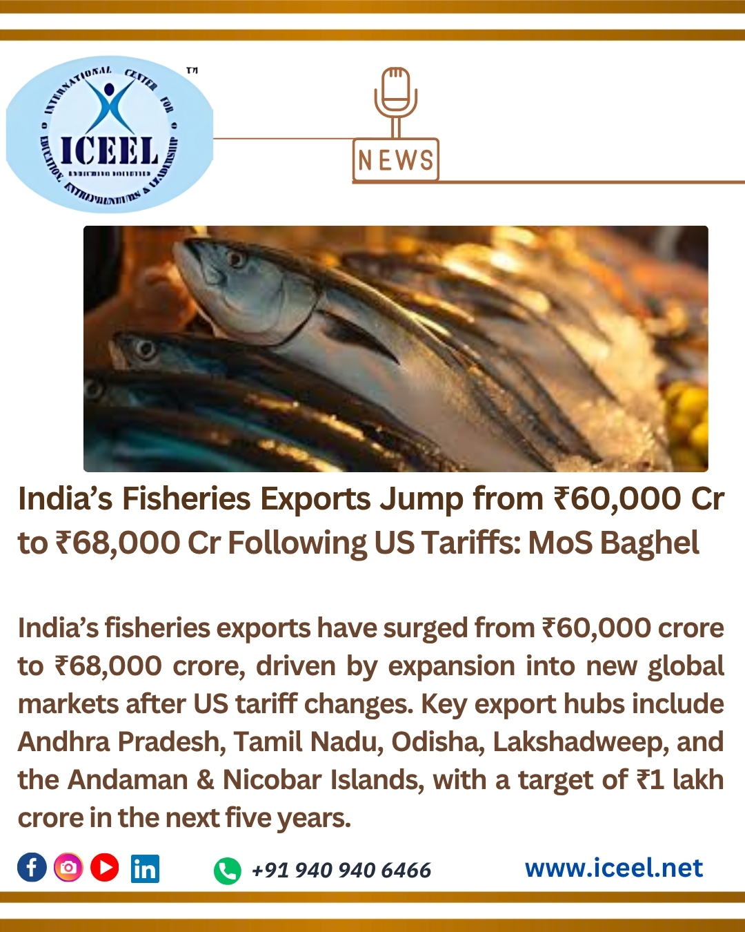 ๐๐ India’s Fisheries Exports on the Rise! India’s fisheries exports have grown significantly from โน60,000 crore to โน68,000 crore, as shared by MoS Fisheries S.P. Singh Baghel (April 11, 2026). This growth comes as India successfully tapped into new global markets after US tariff changes. ๐๐ โจ Key Highlights: โ๏ธ Market Diversification: Expanded exports to Europe, Latin America, the Middle East & Asia โ๏ธ Export Target: โน1 lakh crore in the next 5 years โ๏ธ Top Products: Prawns, tuna & other fish varieties โ๏ธ Key Hubs: Andhra Pradesh, Tamil Nadu, Odisha, Lakshadweep & Andaman & Nicobar Islands โ๏ธ Strong Growth: FY26 (Apr–Oct 2025) exports up 16% to $4.87 billion โ๏ธ New Opportunities: High growth in markets like Vietnam & China offset US slowdown ๐ India’s seafood sector is proving resilient and globally competitive!